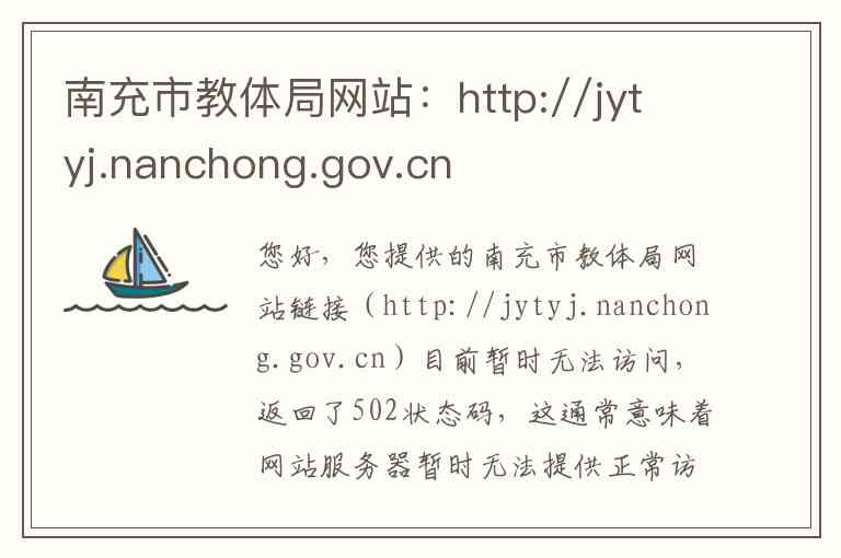 您好,您提供的南充市教体局网站链接(http://jytyj.nanchong.gov.cn)目前暂时无法访问,返回了502状态码,这通常意味着网站服务器暂时无法提供正常访问,可能是由于网络或服务器维护等原因造成的。