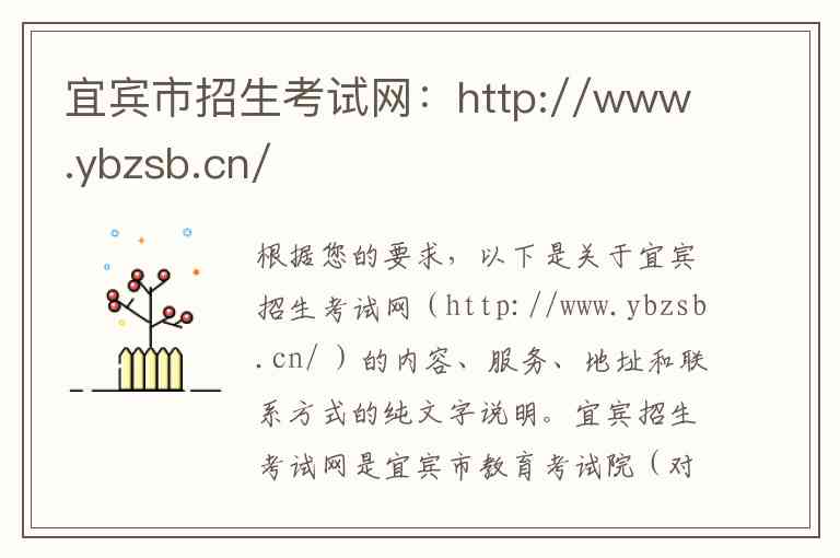 根据您的要求,以下是关于宜宾招生考试网(http://www.ybzsb.cn/ )的内容、服务、地址和联系方式的纯文字说明。