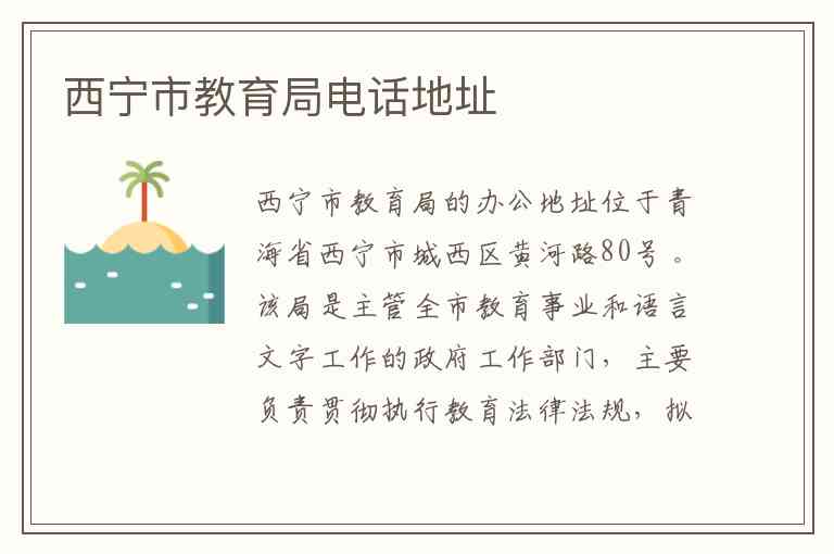 西宁市教育局的办公地址位于青海省西宁市城西区黄河路80号 。该局是主管全市教育事业和语言文字工作的政府工作部门,主要负责贯彻执行教育法律法规,拟订教育发展规划,管理学前教育、基础教育、职业教育等各级各类教育,并指导学校的教育教学改革、思想政治工作、体育卫生与艺术教育及安全工作等 。