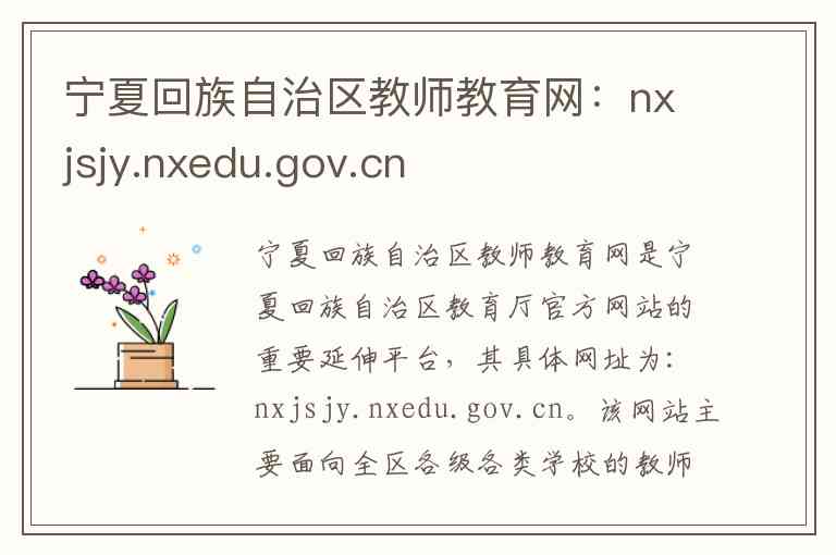 宁夏回族自治区教师教育网是宁夏回族自治区教育厅官方网站的重要延伸平台,其具体网址为:nxjsjy.nxedu.gov.cn。该网站主要面向全区各级各类学校的教师、教育工作者以及有志于从事教育事业的人员,提供教师专业发展、继续教育、政策查询及管理服务的一站式平台。