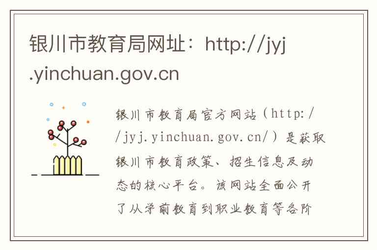 银川市教育局官方网站(http://jyj.yinchuan.gov.cn/)是获取银川市教育政策、招生信息及动态的核心平台。该网站全面公开了从学前教育到职业教育等各阶段的教育信息,并提供便捷的线上服务与查询功能。