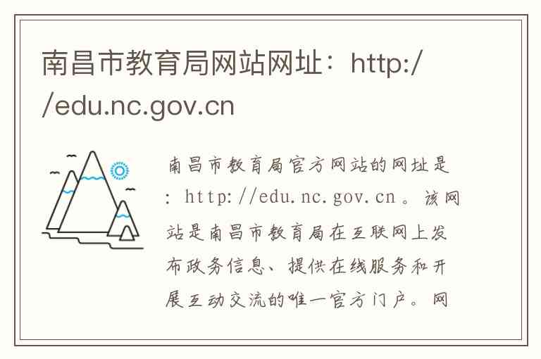 南昌市教育局官方网站的网址是:http://edu.nc.gov.cn 。该网站是南昌市教育局在互联网上发布政务信息、提供在线服务和开展互动交流的唯一官方门户。