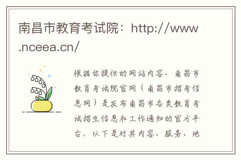 根据你提供的网站内容,南昌市教育考试院官网(南昌市招考信息网)是发布南昌市各类教育考试招生信息和工作通知的官方平台。以下是对其内容、服务、地址和联系方式的详细说明: