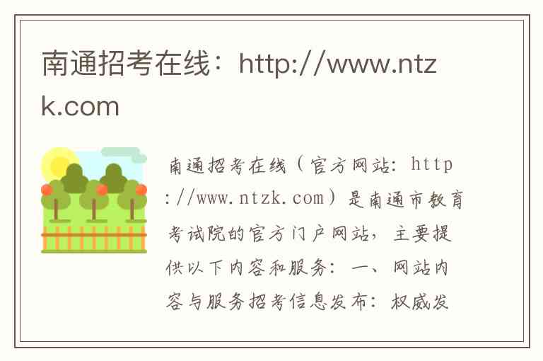 南通招考在线(官方网站:http://www.ntzk.com)是南通市教育考试院的官方门户网站,主要提供以下内容和服务: