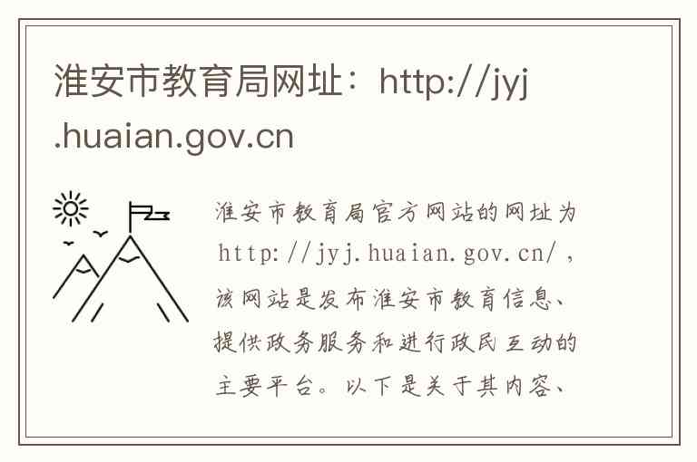 淮安市教育局官方网站的网址为 http://jyj.huaian.gov.cn/ ,该网站是发布淮安市教育信息、提供政务服务和进行政民互动的主要平台。以下是关于其内容、服务及联系方式的详细说明。