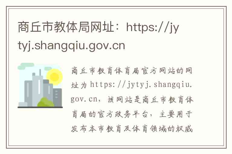 商丘市教育体育局官方网站的网址为 https://jytyj.shangqiu.gov.cn,该网站是商丘市教育体育局的官方政务平台,主要用于发布本市教育及体育领域的权威信息与服务。