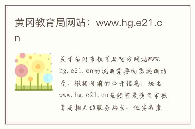 需要向您说明的是,根据目前的公开信息,域名www.hg.e21.cn虽然曾是黄冈市教育局相关的服务站点,但其备案主体为“湖北省教育信息化发展中心(湖北省电化教育馆)” 。当前,黄冈市教育局的官方网站已变更为黄冈市人民政府下属的部门网站,网址为http://jyj.hg.gov.cn/ 。以下内容主要基于黄冈市教育局的新版官方网站进行介绍。