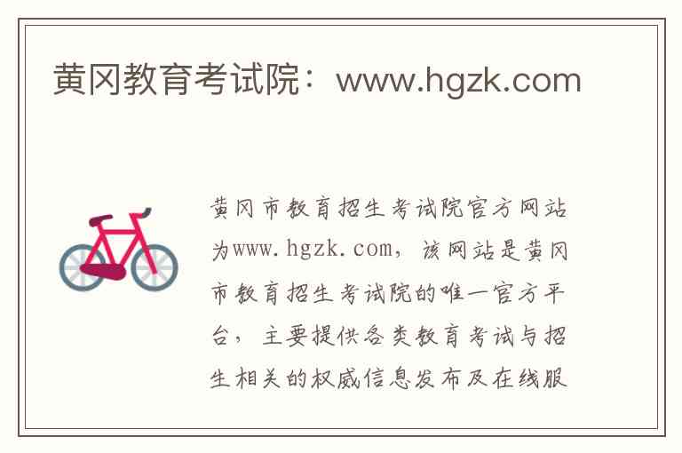 黄冈市教育招生考试院官方网站为www.hgzk.com,该网站是黄冈市教育招生考试院的唯一官方平台,主要提供各类教育考试与招生相关的权威信息发布及在线服务。