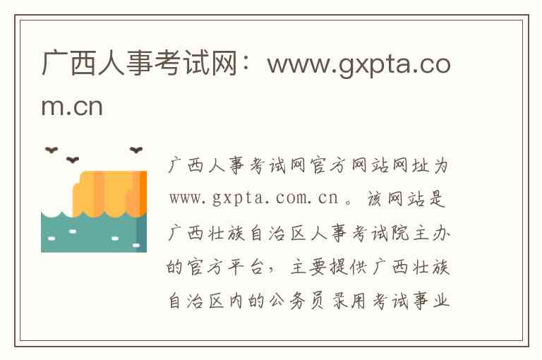 广西人事考试网官方网站网址为 www.gxpta.com.cn 。该网站是广西壮族自治区人事考试院主办的官方平台,主要提供广西壮族自治区内的公务员录用考试事业单位公开招聘以及各类专业技术人员职业资格考试的官方信息与服务 。