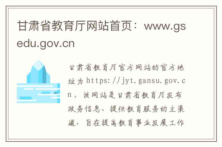 甘肃省教育厅官方网站的官方地址为 https://jyt.gansu.gov.cn 。该网站是甘肃省教育厅发布政务信息、提供教育服务的主渠道,旨在提高教育事业发展工作透明度,畅通与人民群众的沟通渠道 。