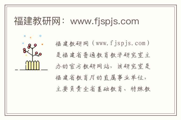 福建教研网(www.fjspjs.com)是福建省普通教育教学研究室主办的官方教研网站,该研究室是福建省教育厅的直属事业单位,主要负责全省基础教育、特殊教育、学前教育等领域的教学研究与指导工作。