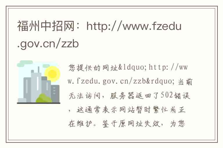 您提供的网址“http://www.fzedu.gov.cn/zzb”当前无法访问,服务器返回了502错误,这通常表示网站暂时繁忙或正在维护。