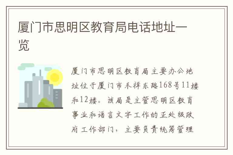 厦门市思明区教育局主要办公地址位于厦门市禾祥东路168号11楼和12楼。该局是主管思明区教育事业和语言文字工作的正处级政府工作部门,主要负责统筹管理全区基础教育、学前教育、特殊教育及民办教育,制定教育发展规划,指导学校招生、学籍管理、教育教学改革,以及教师队伍建设等工作。