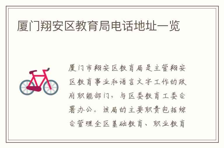 厦门市翔安区教育局是主管翔安区教育事业和语言文字工作的政府职能部门,与区委教育工委合署办公。该局的主要职责包括综合管理全区基础教育、职业教育、终身教育及幼儿教育工作,依法对各级各类学校进行检查和评估,推进素质教育,以及负责全区教师队伍的建设与管理等。