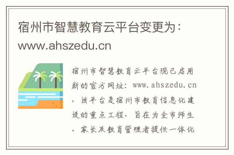 宿州市智慧教育云平台现已启用新的官方网址:www.ahszedu.cn,该平台是宿州市教育信息化建设的重点工程,旨在为全市师生、家长及教育管理者提供一体化的在线教育服务。