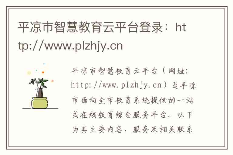 平凉市智慧教育云平台(网址:http://www.plzhjy.cn)是平凉市面向全市教育系统提供的一站式在线教育综合服务平台。以下为其主要内容、服务及相关联系方式说明: