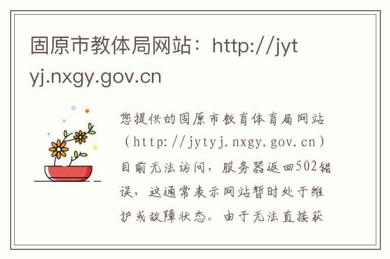 您提供的固原市教育体育局网站(http://jytyj.nxgy.gov.cn)目前无法访问,服务器返回502错误,这通常表示网站暂时处于维护或故障状态。