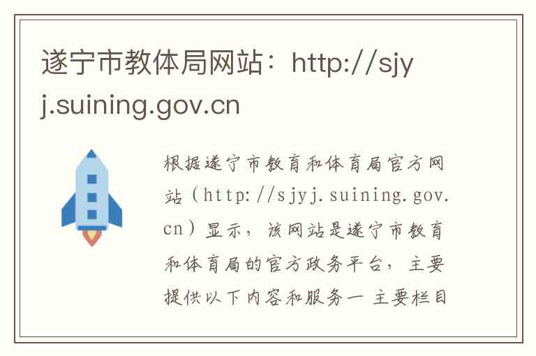 根据遂宁市教育和体育局官方网站(http://sjyj.suining.gov.cn)显示,该网站是遂宁市教育和体育局的官方政务平台,主要提供以下内容和服务
