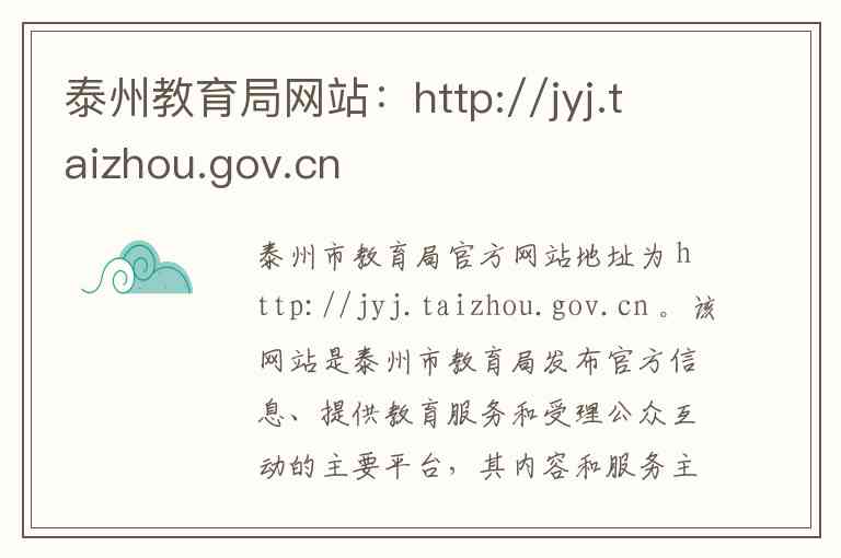 泰州市教育局官方网站地址为 http://jyj.taizhou.gov.cn 。该网站是泰州市教育局发布官方信息、提供教育服务和受理公众互动的主要平台,其内容和服务主要包含以下几个方面: