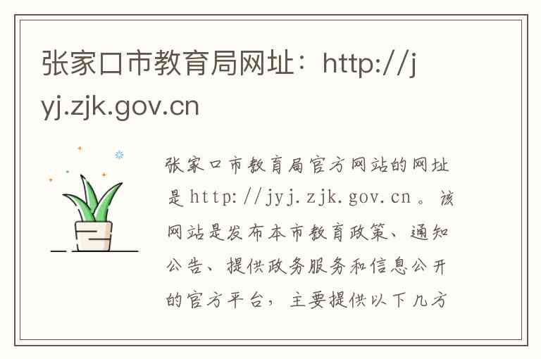 张家口市教育局官方网站的网址是 http://jyj.zjk.gov.cn 。该网站是发布本市教育政策、通知公告、提供政务服务和信息公开的官方平台,主要提供以下几方面的内容和服务: