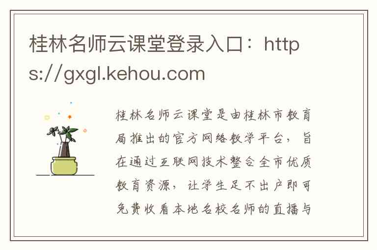 桂林名师云课堂是由桂林市教育局推出的官方网络教学平台,旨在通过互联网技术整合全市优质教育资源,让学生足不出户即可免费收看本地名校名师的直播与录播课程。该平台由桂林市教育科学研究所负责教学计划制定与组织实施,桂林市电教仪器站提供技术支持。