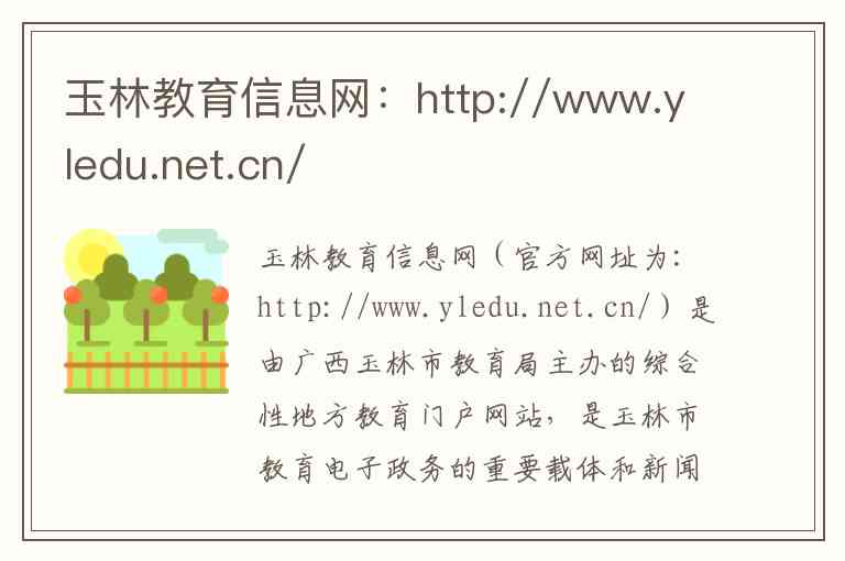 官方网站:玉林市教育局的另一个官方网址为 http://edu.yulin.gov.cn/ (玉林市人民政府网站下属频道)。