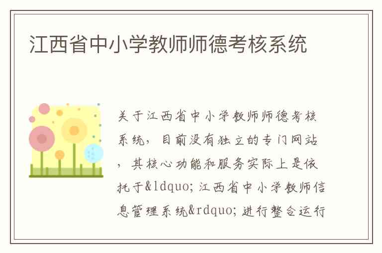 关于江西省中小学教师师德考核系统,目前没有独立的专门网站,其核心功能和服务实际上是依托于“江西省中小学教师信息管理系统”进行整合运行的。该系统的主要目的是实现师德师风建设的常态化、长效化管理。