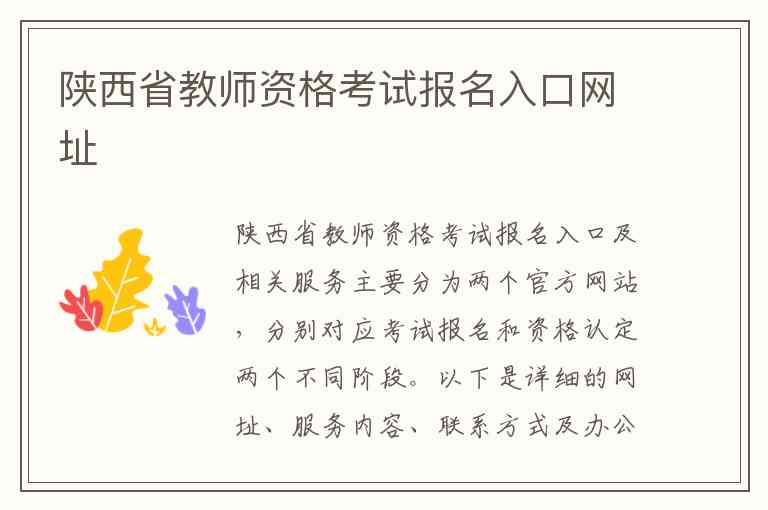 陕西省教师资格考试报名入口及相关服务主要分为两个官方网站,分别对应考试报名和资格认定两个不同阶段。以下是详细的网址、服务内容、联系方式及办公地址信息。