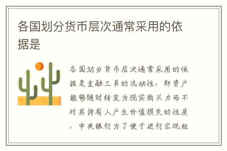 各国划分货币层次通常采用的依据是金融工具的流动性,即资产能够随时转变为现实购买力而不对其持有人产生价值损失的性质。中央银行为了便于进行宏观经济运行监测和货币政策操作,按照不同的统计口径,以资产作为流通手段和支付手段的方便程度为标准,将货币供应量划分为不同的层次。流动性越强的金融工具,所处的货币层次越低(如M0),反之则越高(如M2、M3)。