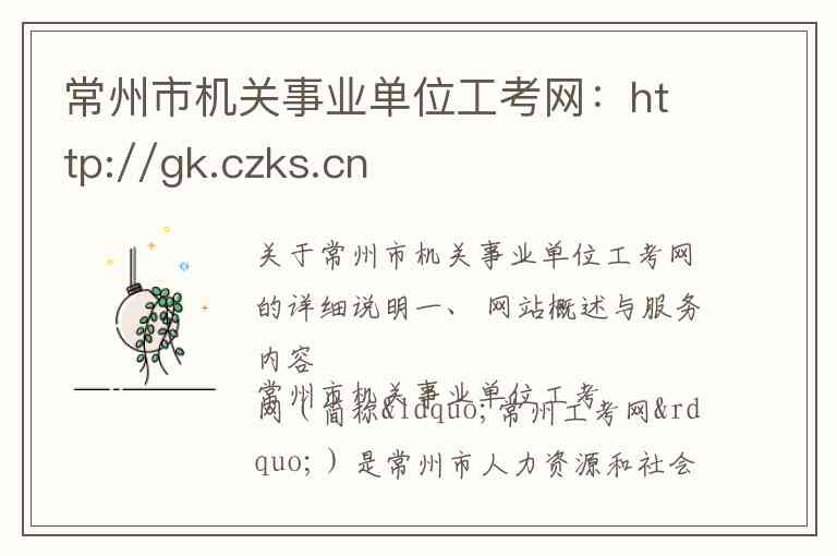 常州市机关事业单位工考网(简称“常州工考网”)是常州市人力资源和社会保障局下属常州市人事考试中心主办的官方网站,主要服务于常州市机关事业单位工勤人员。该平台的核心功能是实现工勤人员继续教育的全程网络化办理,具体服务内容包括: