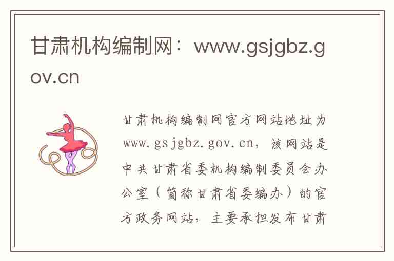 甘肃机构编制网官方网站地址为 www.gsjgbz.gov.cn,该网站是中共甘肃省委机构编制委员会办公室(简称甘肃省委编办)的官方政务网站,主要承担发布甘肃省行政管理体制改革、机构改革以及机构编制管理等相关政策法规、工作动态和通知公告的职能。
