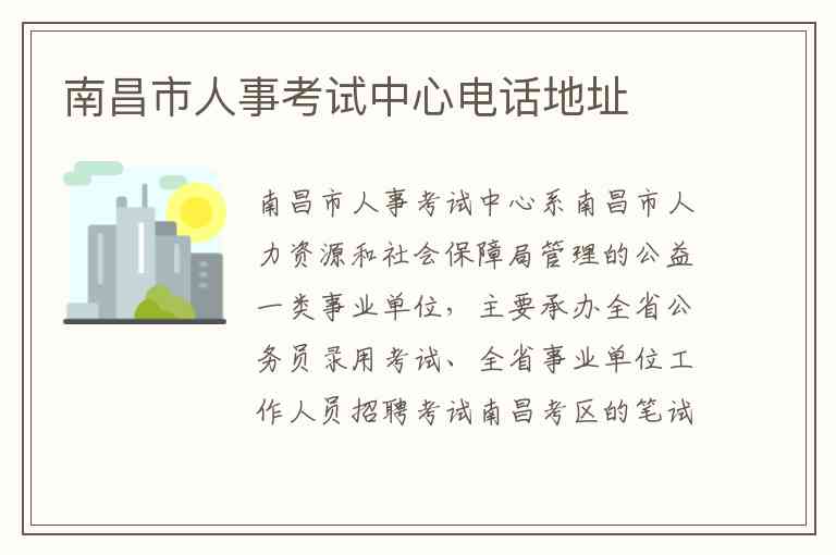 南昌市人事考试中心系南昌市人力资源和社会保障局管理的公益一类事业单位,主要承办全省公务员录用考试、全省事业单位工作人员招聘考试南昌考区的笔试考务工作,以及全国、全省专业技术人员资格和执(职)业资格考试南昌考区的笔试考务工作。同时,该中心还承担全市事业单位工作人员招聘考试和相关人事考试笔试试卷命题、考务的事务性工作,以及机关、事业单位、社会组织委托的其他人事考试考务工作。