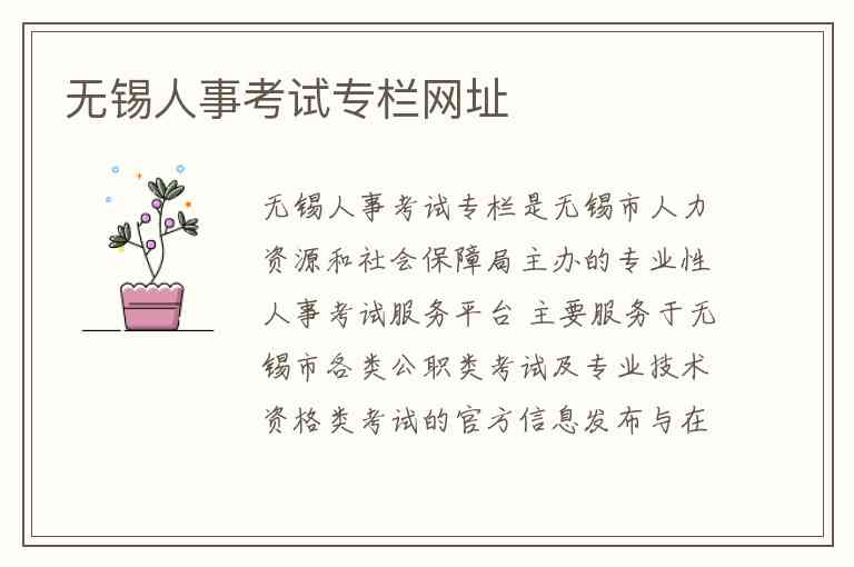 无锡人事考试专栏是无锡市人力资源和社会保障局主办的专业性人事考试服务平台 主要服务于无锡市各类公职类考试及专业技术资格类考试的官方信息发布与在线办理 该专栏的核心网址是http://hrss.wuxi.gov.cn/ztzl/wxrskszl/index.shtml 该地址直接归属于无锡市人民政府的官方网站体系 确保了信息的权威性与安全性