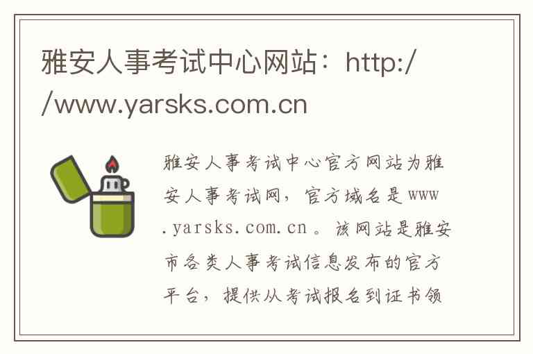 雅安人事考试中心官方网站为雅安人事考试网,官方域名是 www.yarsks.com.cn 。该网站是雅安市各类人事考试信息发布的官方平台,提供从考试报名到证书领取的一站式服务 。