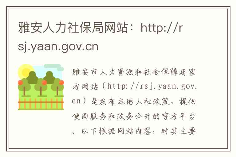 雅安市人力资源和社会保障局官方网站(http://rsj.yaan.gov.cn)是发布本地人社政策、提供便民服务和政务公开的官方平台。以下根据网站内容,对其主要功能、服务板块及联系方式进行具体说明。