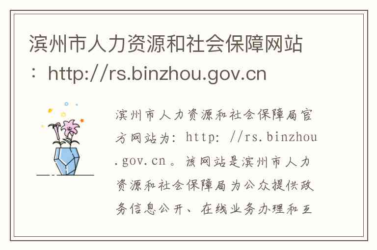 滨州市人力资源和社会保障局官方网站为:http://rs.binzhou.gov.cn 。该网站是滨州市人力资源和社会保障局为公众提供政务信息公开、在线业务办理和互动交流的一站式服务平台,其前身为“滨州市人力资源和社会保障网”,后经过改版,整合了多个子网站,形成了“1+5”模式的网站群,实现了从信息发布向综合服务的转变 。