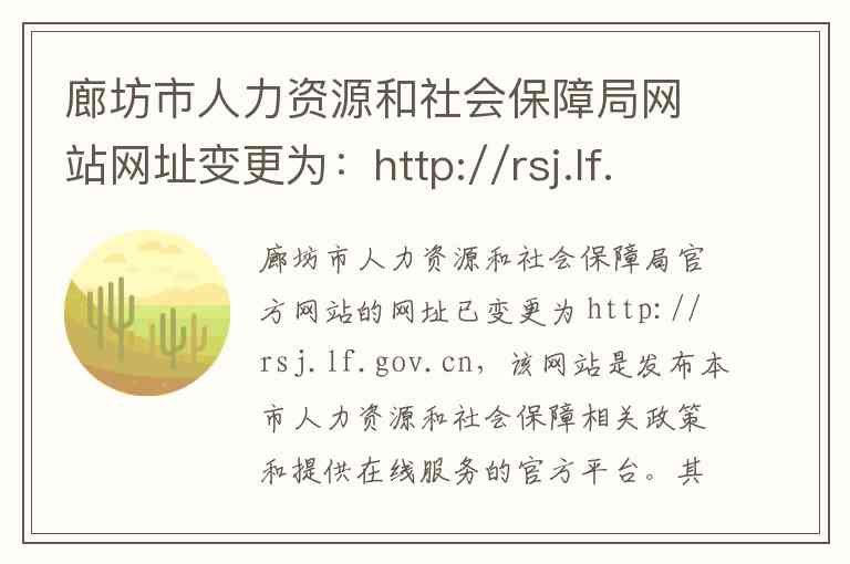 廊坊市人力资源和社会保障局官方网站的网址已变更为 http://rsj.lf.gov.cn,该网站是发布本市人力资源和社会保障相关政策和提供在线服务的官方平台。其内容和服务主要分为以下几个板块,并附有详细的联系信息。