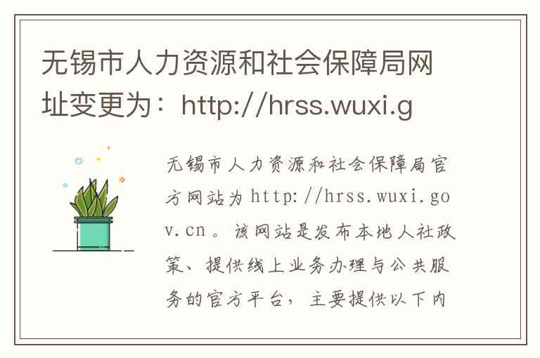 无锡市人力资源和社会保障局官方网站为 http://hrss.wuxi.gov.cn 。该网站是发布本地人社政策、提供线上业务办理与公共服务的官方平台,主要提供以下内容和服务