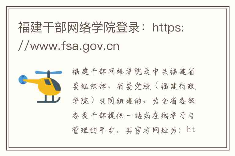 福建干部网络学院是中共福建省委组织部、省委党校(福建行政学院)共同组建的,为全省各级各类干部提供一站式在线学习与管理的平台。其官方网址为:https://www.fsa.gov.cn 。
