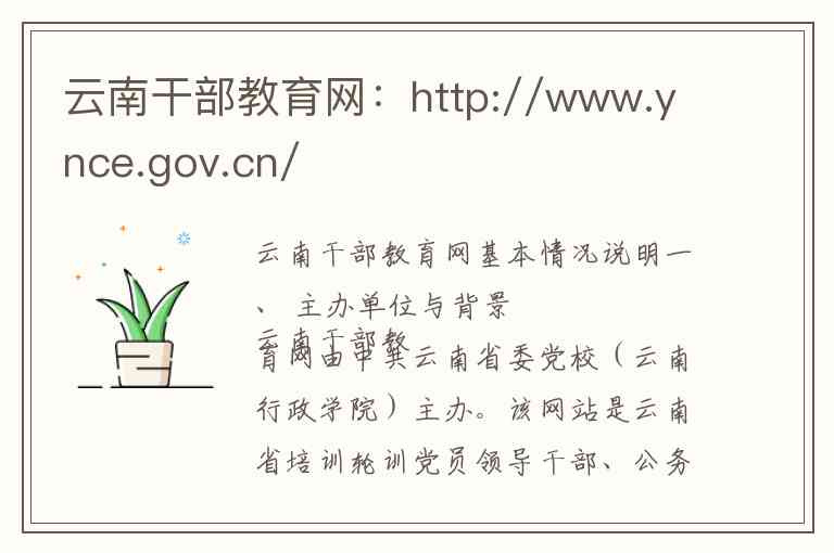 云南干部教育网由中共云南省委党校(云南行政学院)主办。该网站是云南省培训轮训党员领导干部、公务员及公共管理人员的重要平台,主要承担干部教育培训、理论宣传、政策研究及决策咨询等职能。