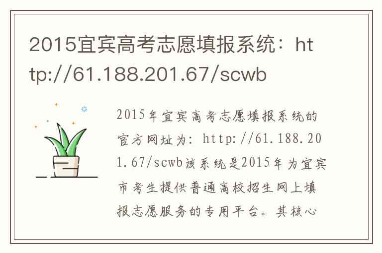 该系统是2015年为宜宾市考生提供普通高校招生网上填报志愿服务的专用平台。其核心内容和服务的具体说明如下: