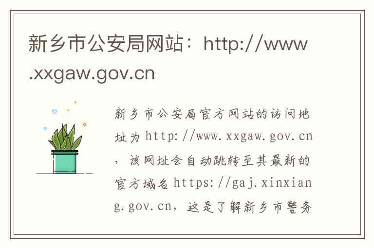 新乡市公安局官方网站的访问地址为 http://www.xxgaw.gov.cn,该网址会自动跳转至其最新的官方域名 https://gaj.xinxiang.gov.cn,这是了解新乡市警务工作、办理相关业务及获取权威信息的核心平台。