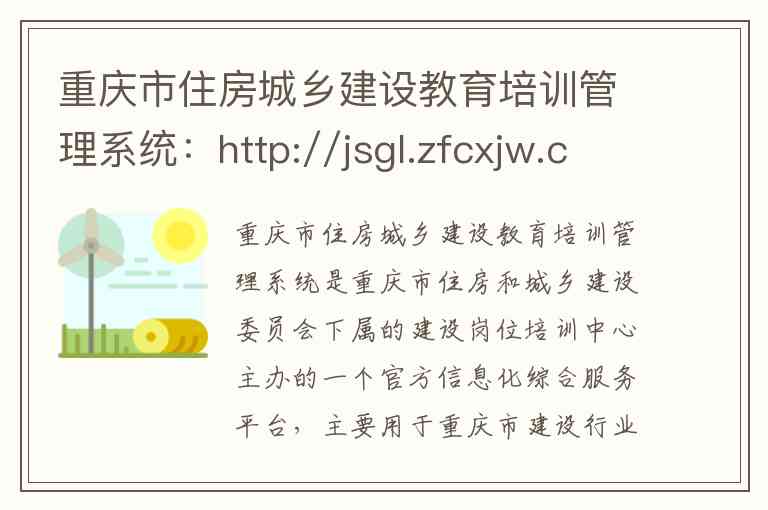 重庆市住房城乡建设教育培训管理系统是重庆市住房和城乡建设委员会下属的建设岗位培训中心主办的一个官方信息化综合服务平台,主要用于重庆市建设行业从业人员的管理与服务工作。该平台的核心网址为:http://jsgl.zfcxjw.cq.gov.cn:8005 ,其完整的登录页面地址为 http://jsgl.zfcxjw.cq.gov.cn:8005/cqjsgwjypx/login 。
