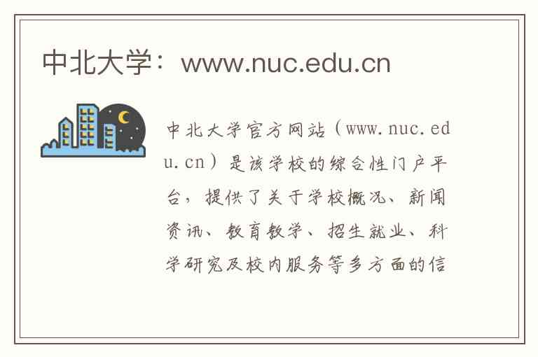 中北大学官方网站(www.nuc.edu.cn)是该学校的综合性门户平台,提供了关于学校概况、新闻资讯、教育教学、招生就业、科学研究及校内服务等多方面的信息。