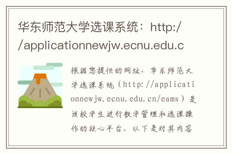 根据您提供的网址,华东师范大学选课系统(http://applicationnewjw.ecnu.edu.cn/eams)是该校学生进行教学管理和选课操作的核心平台。以下是对其内容、服务及关键信息的详细说明。