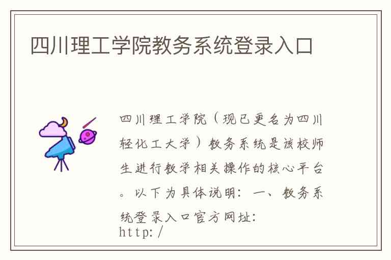 四川理工学院(现已更名为四川轻化工大学)教务系统是该校师生进行教学相关操作的核心平台。以下为具体说明: