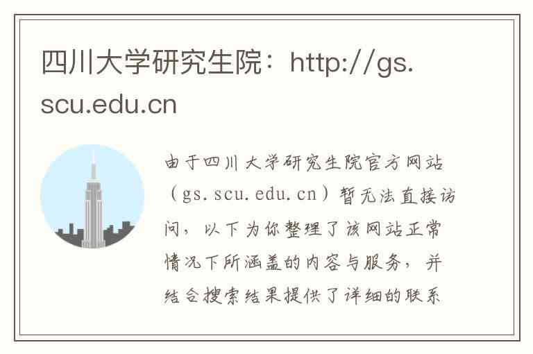 由于四川大学研究生院官方网站(gs.scu.edu.cn)暂无法直接访问,以下为你整理了该网站正常情况下所涵盖的内容与服务,并结合搜索结果提供了详细的联系方式和地址信息,供你参考。
