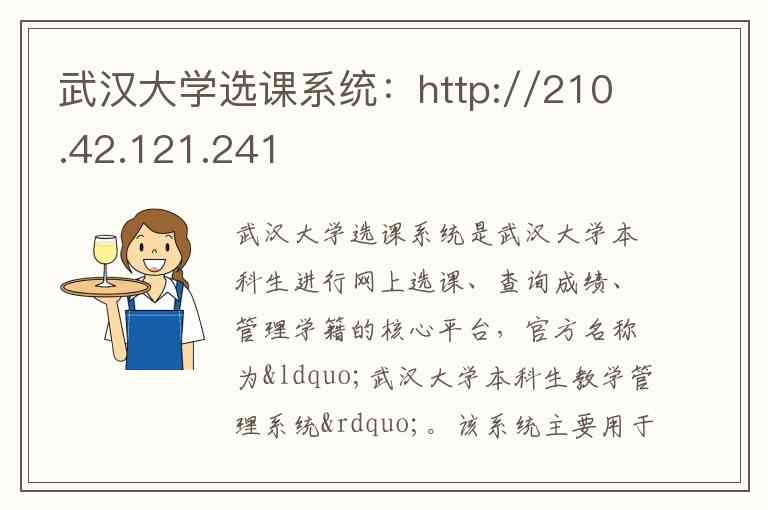 关于系统地址,根据历史资料,您提供的网址 http://210.42.121.241 是系统入口之一。为防止访问高峰时出现网络拥堵,学校还提供了其他几个备用地址,包括 http://210.42.121.132 、 http://210.42.121.133 以及 http://210.42.121.134 。同时,学校也启用了新的选课入口域名 bkxk.whu.edu.cn 。推荐使用谷歌、火狐或IE8及以上版本的浏览器访问系统,以获得最佳体验。