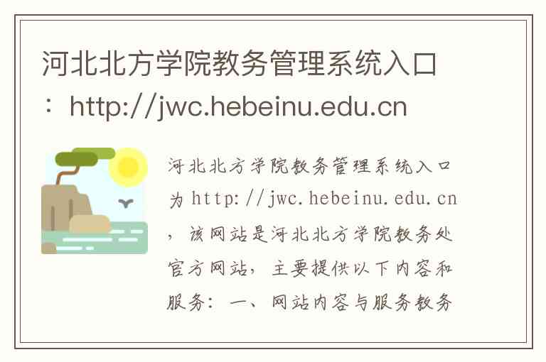 河北北方学院教务管理系统入口为 http://jwc.hebeinu.edu.cn,该网站是河北北方学院教务处官方网站,主要提供以下内容和服务: