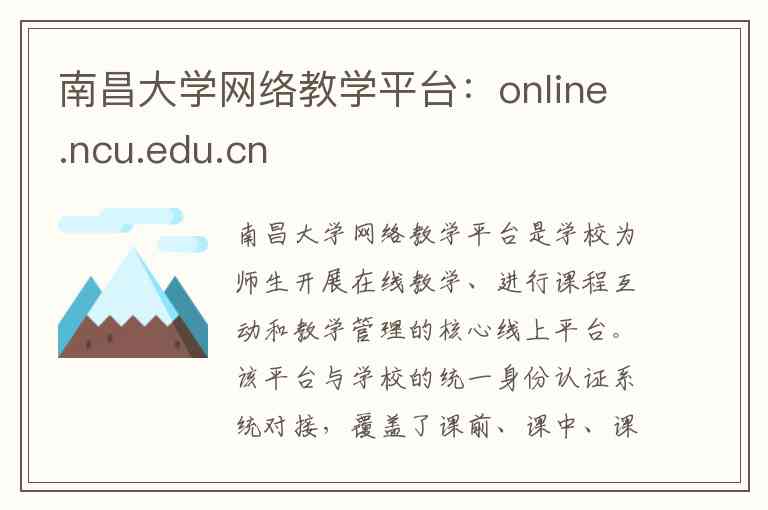 南昌大学网络教学平台是学校为师生开展在线教学、进行课程互动和教学管理的核心线上平台。该平台与学校的统一身份认证系统对接,覆盖了课前、课中、课后全流程的教学活动,是学生日常学习不可或缺的工具。